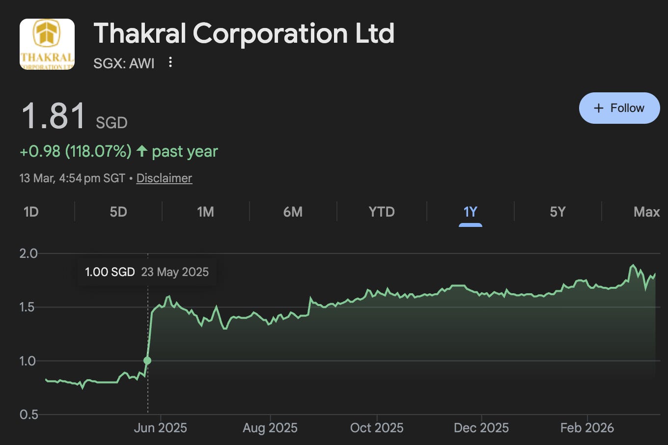I would have like to take some credit for the initial price discovery for Thakral from < SGD 1.00 to today’s price.