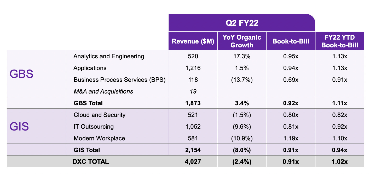 If we are to look at FY22 YTD Book-to-Bill column, the DXC total stands at 1.02. Management had indicated in the conference call that there has been a timing delay for closing of two GIS deal which had lead to the current shortfall.