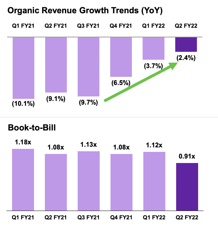 On the portion of the troubled accounts, there is a clear deceleration of negative organic revenue growth. Since organic revenue growth is a backward looking instrument, looking at book-to-bill would be a forward looking indicator.